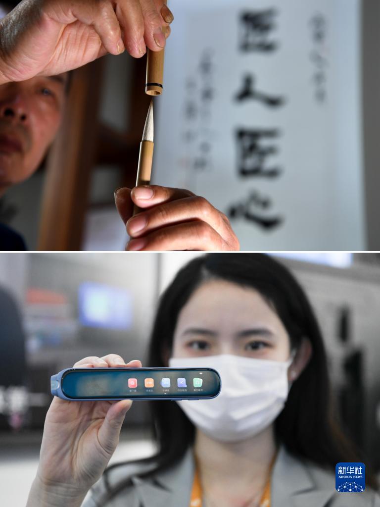 這是一張拼版照片:上圖為國家級非物質(zhì)文化遺產(chǎn)“宣筆制作技藝”代表性傳承人佘征軍在涇縣“守藝人”工作室展示自己制作的宣筆(新華社記者韓曉雨2020年6月5日攝);下圖為2022世界制造業(yè)大會上工作人員展示科大訊飛生產(chǎn)的一款AI翻譯筆(新華社記者張端2022年9月20日攝)。