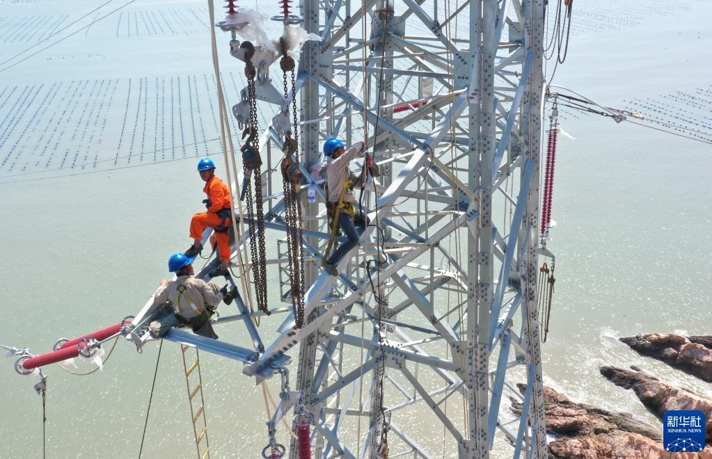 9月21日,國網福建省送變電工程有限公司施工人員在寧德市霞浦縣的B7塔處架線施工(無人機照片)。