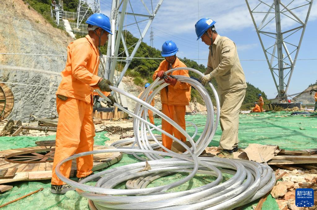 9月21日,國網福建省送變電工程有限公司施工人員在寧德市霞浦縣的B7塔處架線施工。
