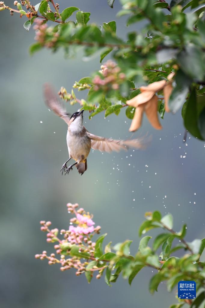貴州省仁懷市一公園內,飛舞的小鳥在秋雨后的花枝間蕩起水珠(9月12日攝)。