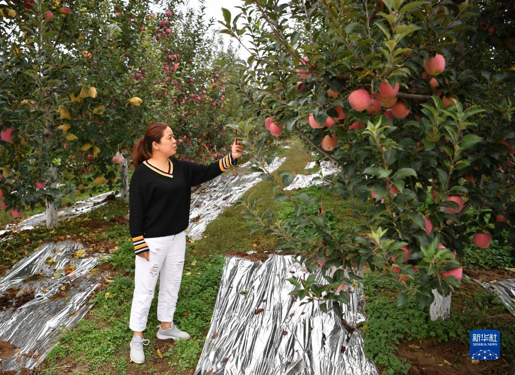 9月20日,洛川縣鳳棲街道高堡村村民谷向艷在果園中通過手機向客戶展示蘋果。