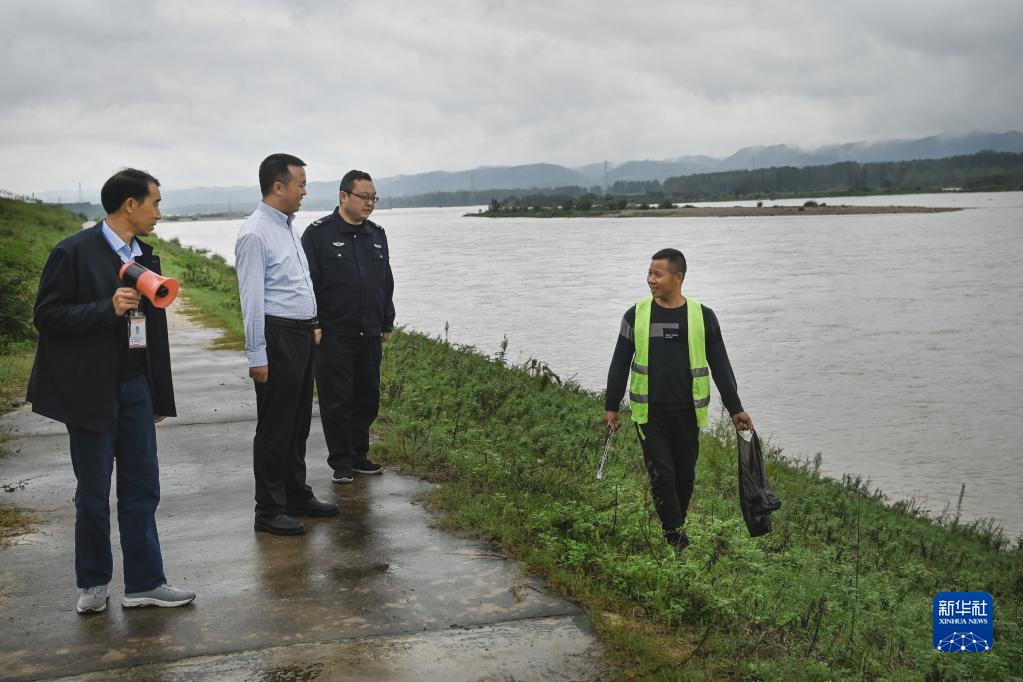 全國優(yōu)秀河(湖)長、鎮(zhèn)級(jí)河長肖利安(左二)與村級(jí)河長周明(左一)等在漢江邊開展聯(lián)合巡河工作(9月20日攝)。