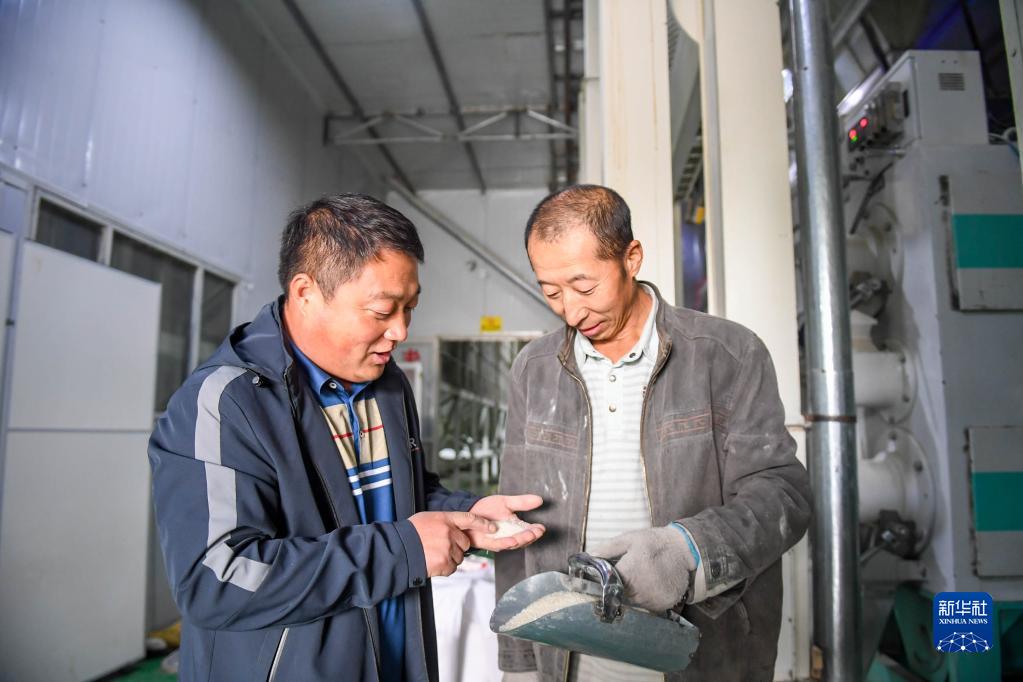 9月22日,內蒙古興安盟烏蘭浩特市義勒力特鎮的明武水稻種植專業合作社社員查看加工好的大米質量。
