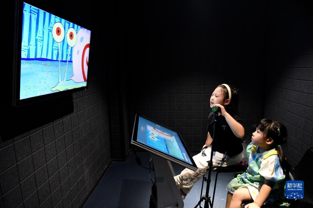 兩名兒童在西影電影藝術(shù)體驗(yàn)中心為動畫片配音(9月11日攝)。