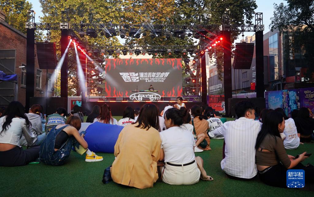 市民及游客在西影“電影圈子”內觀看表演(2021年10月1日攝)。