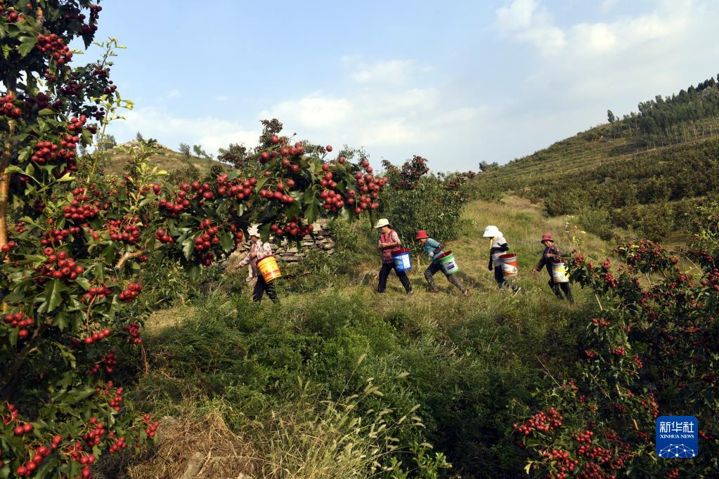 9月21日,新泰市劉杜鎮(zhèn)極品山楂家庭農(nóng)場,工人上山采摘山楂。