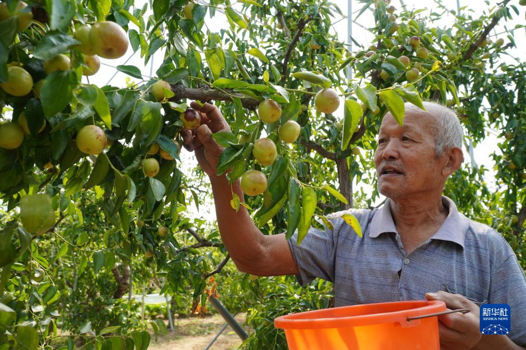 秋分前后,山東省濱州市沾化區大棚冬棗種植園內的冬棗開始大面積進入成熟期,棗農們忙著采摘成熟的冬棗,喜迎豐收。近年來,當地采取“黨支部+合作社+農戶”的方式,積極推廣大棚冬棗,帶動棗農抱團發展、實現增收致富,目前全區大棚冬棗種植面積達到5萬余畝。