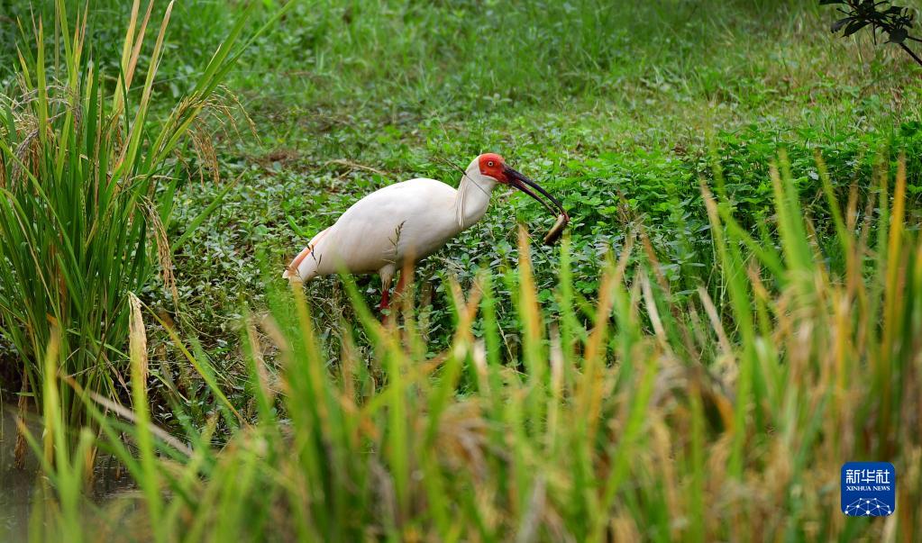 9月22日,一只朱鹮在洋縣紙坊街道草壩村朱鹮保護(hù)區(qū)的稻田里覓食。