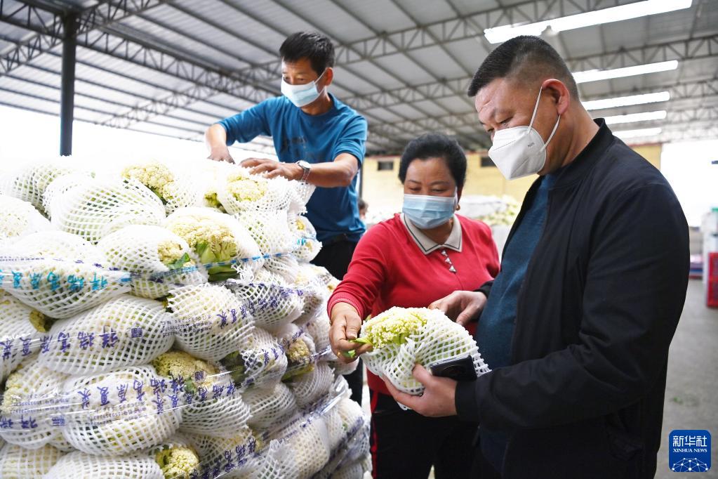 9月20日,在榆中祥龍蔬菜產銷專業合作社,豆俊蘭(中)和商家查看蔬菜品質。