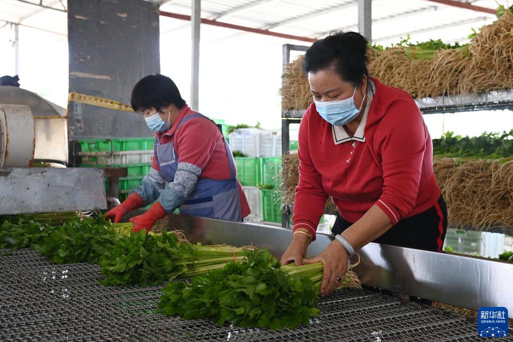 9月20日,在榆中祥龍蔬菜產銷專業合作社,豆俊蘭(右)在清洗作業線上整理芹菜。