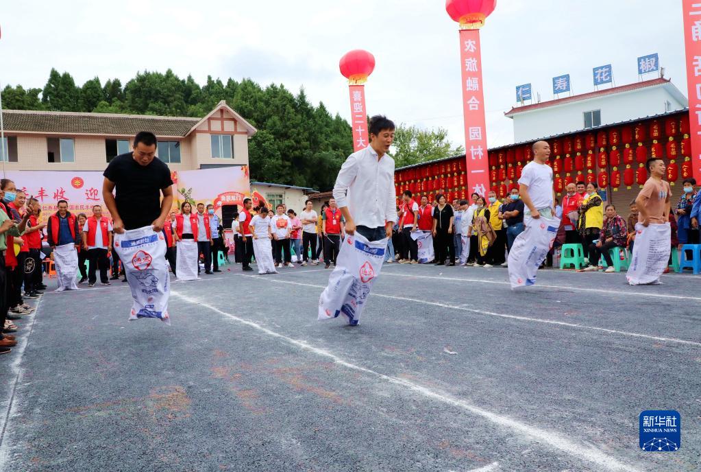 9月21日,在四川省眉山市仁壽縣方家鎮農民趣味運動會上,村民們參加跳糧袋比賽。