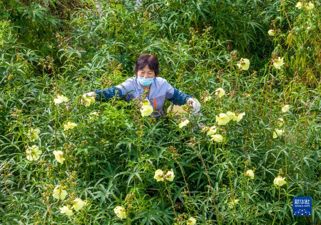 9月21日,江蘇省泰州市大泗鎮(zhèn)馬龍村村民在黃蜀葵種植基地采摘黃蜀葵(無人機照片)。