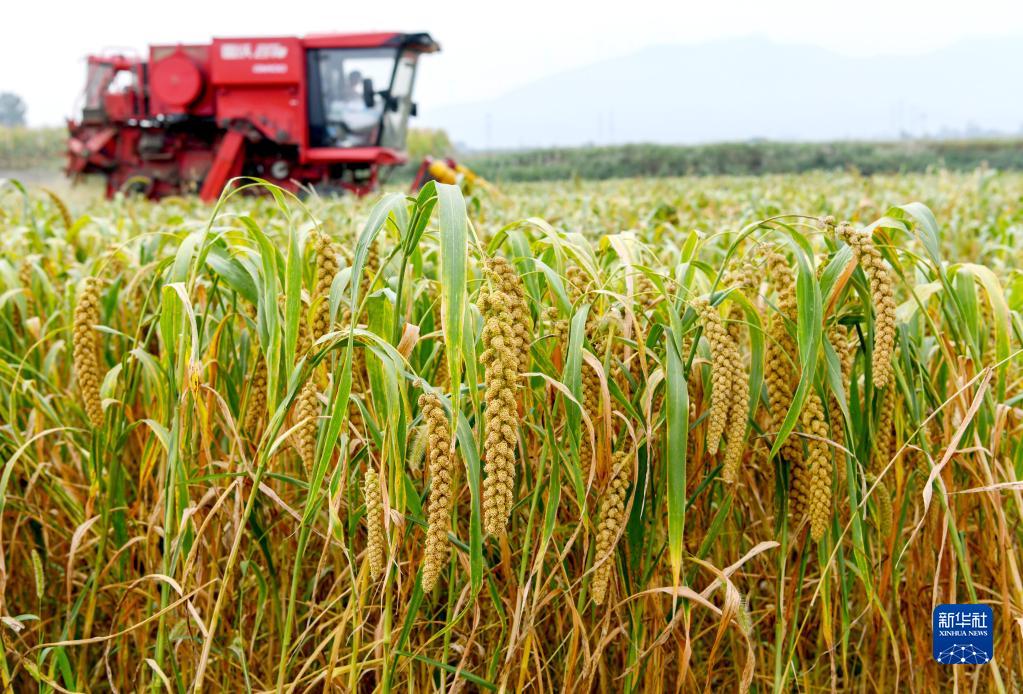 9月21日,在河南省洛陽市伊濱區(qū)寇店鎮(zhèn)二教塔社區(qū),收割機(jī)在地里收割谷子。