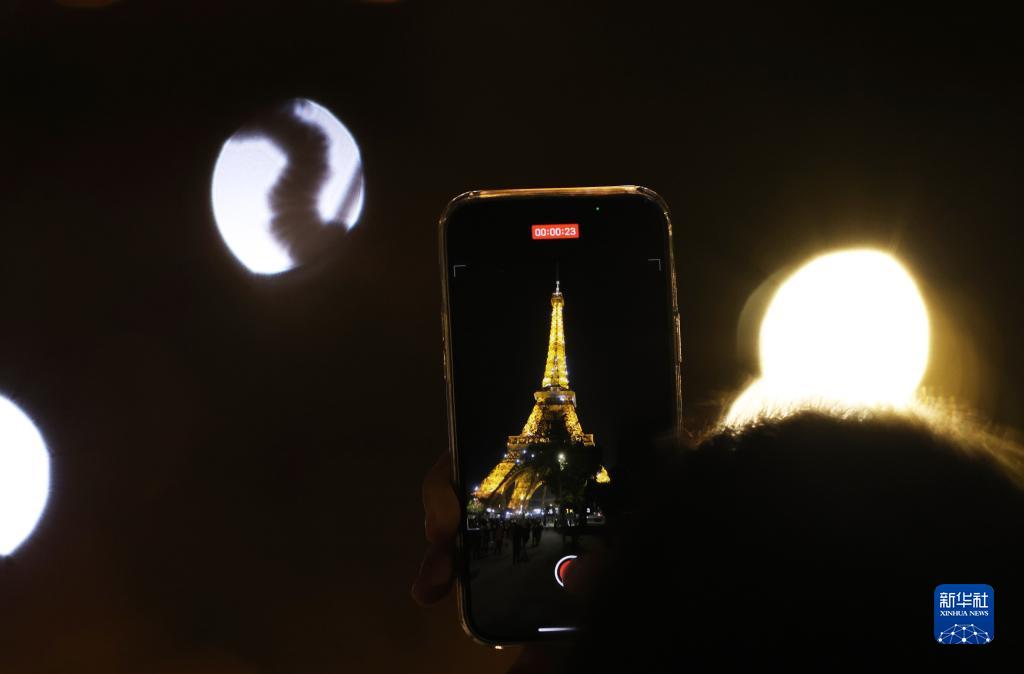 9月22日,一名男子在整點時刻為閃燈的法國巴黎埃菲爾鐵塔錄制視頻。