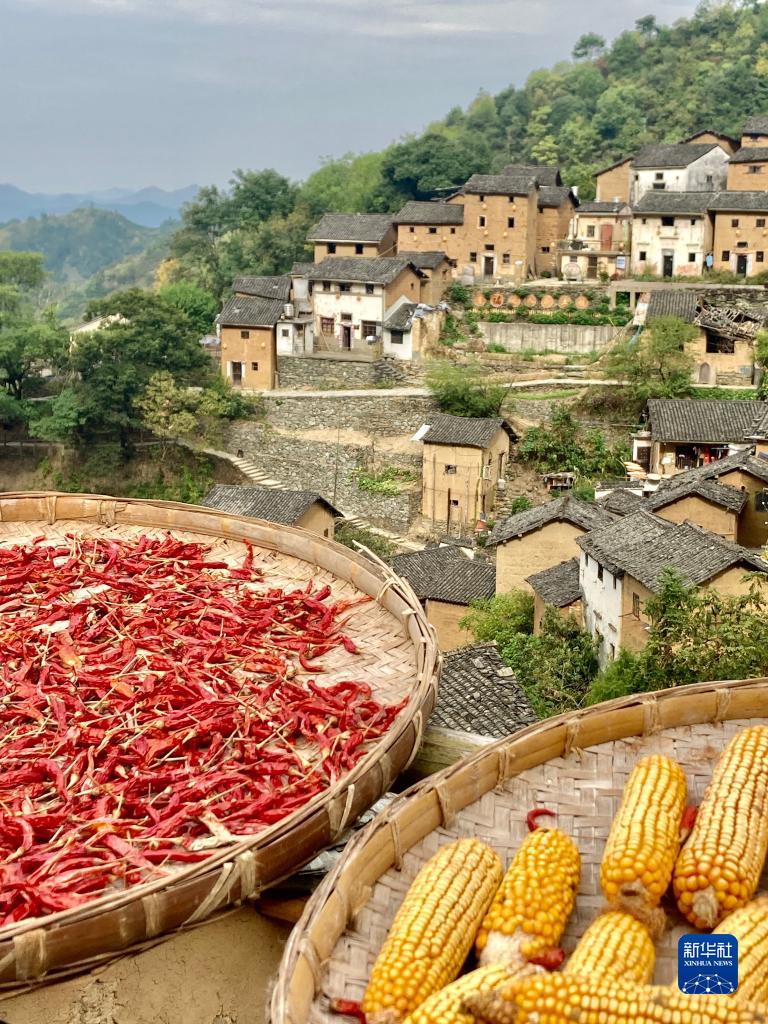 9月23日在安徽省黃山市歙縣陽產土樓拍攝的曬秋圖景。