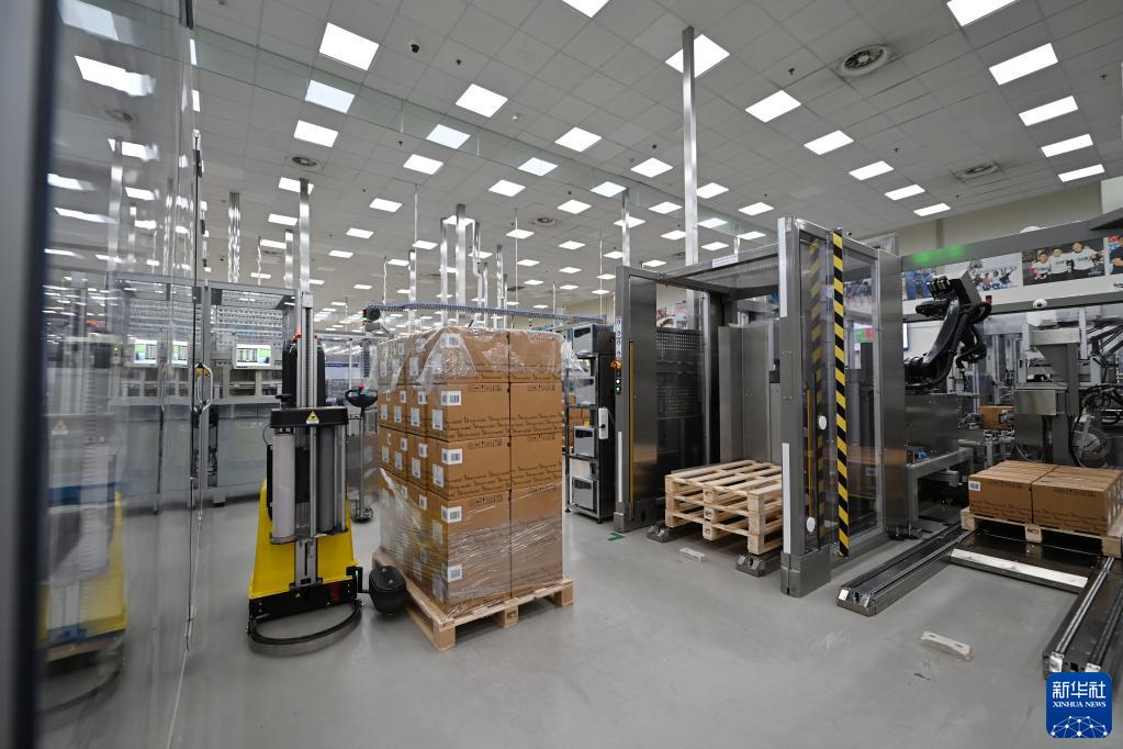 在諾和諾德(中國)制藥有限公司天津生產廠內,纏膜機器人進行包裝作業(9月22日攝)。