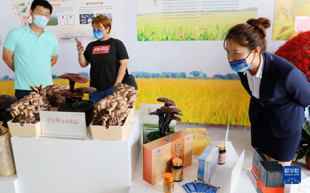 9月23日,參觀者在上海奉賢區莊行鎮浦秀村上海市農科院舉辦的農業技術成果展示會上觀看一組食用菌展品。