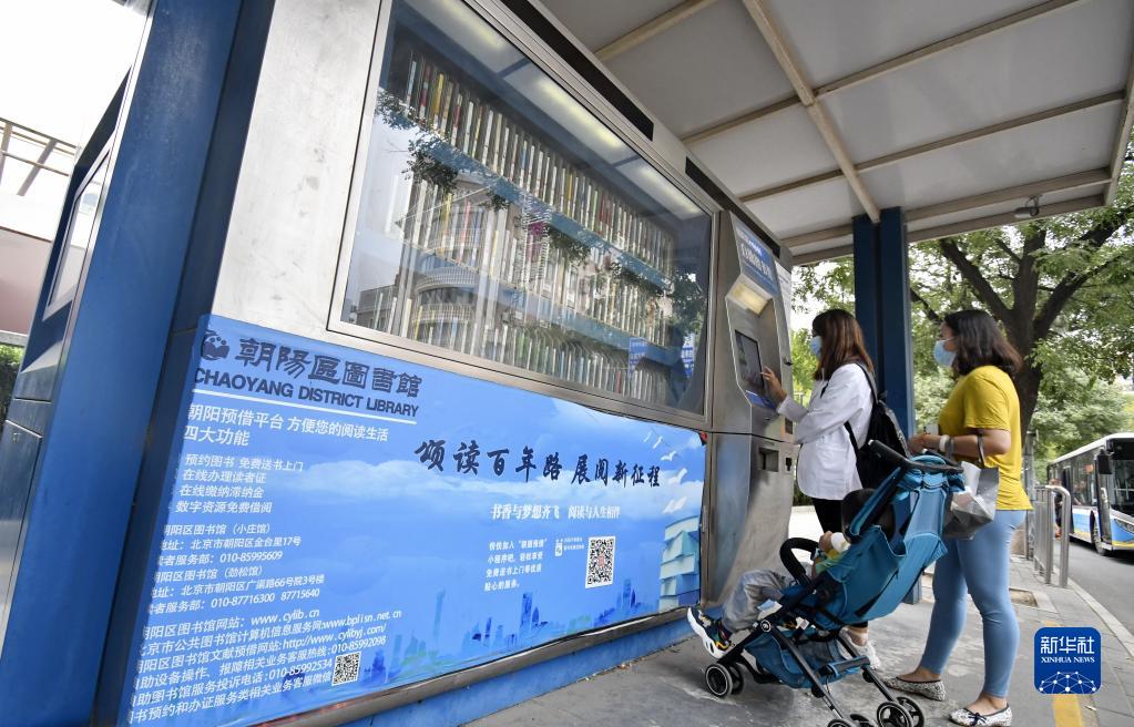 居民在北京市朝陽區(qū)街頭自助圖書館借書(9月19日攝)。