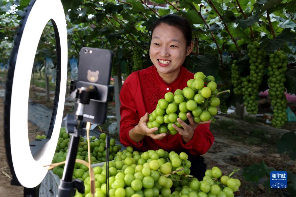 9月20日,在山東省棗莊市孟莊鎮(zhèn)大郭莊村,“90后”牛玲玉在葡萄園直播平臺上推介銷售陽光玫瑰葡萄。牛玲玉大學(xué)畢業(yè)后返鄉(xiāng)創(chuàng)辦了暢想家庭農(nóng)場,其種植的葡萄因?qū)倬G色食品備受消費者青睞。