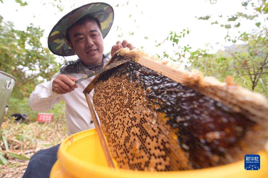 9月20日,在貴州省黔東南苗族侗族自治州岑鞏縣羊橋土家族鄉(xiāng)炮灣村中蜂養(yǎng)殖示范點(diǎn),“80后”袁治敏在采收蜂蜜。2017年,身患?xì)埣驳脑蚊舫闪⑥r(nóng)民專業(yè)合作社從事中蜂養(yǎng)殖。今年他養(yǎng)殖的328箱中蜂迎來采蜜高峰期,預(yù)計收獲蜂蜜3000多斤。