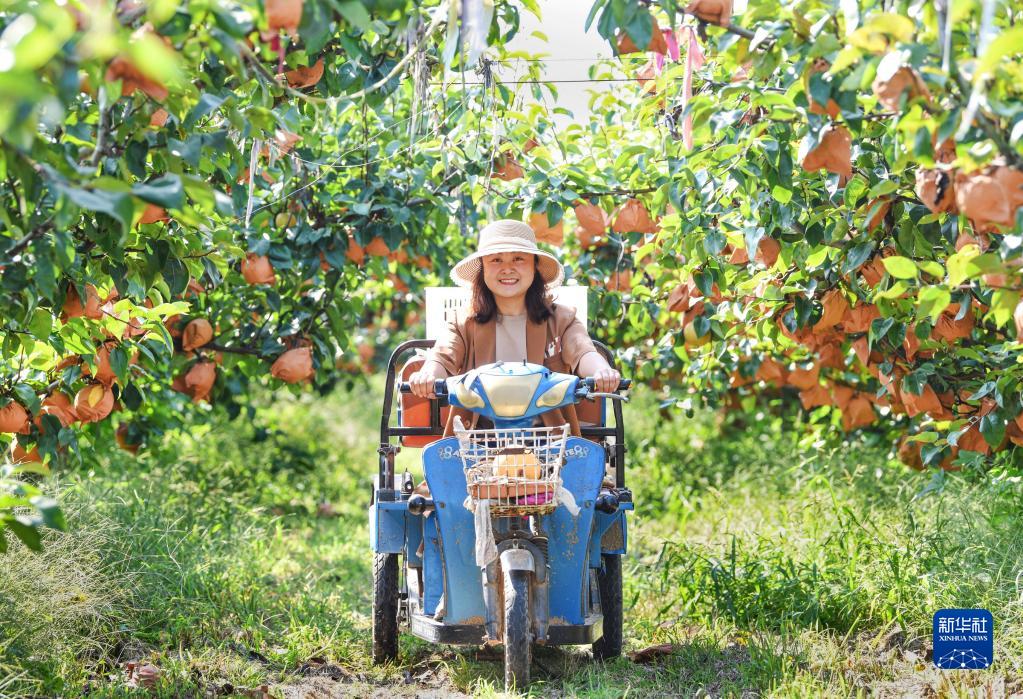 9月22日,在山東省膠州市膠北街道王家莊村秋月農場的梨園里,“80后”王慧芬駕三輪車前來采摘。王慧芬大學畢業后回到老家發展梨樹種植。今年,她種植的200畝“小甜梨”豐收在望。