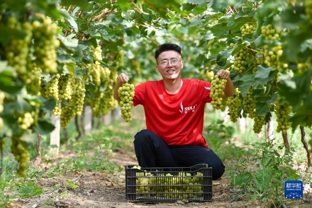 9月23日,在江蘇省宿遷市宿城區(qū)陳集鎮(zhèn)王莊村,“00后”汪碩展示剛采摘的無(wú)公害葡萄。汪碩2021年畢業(yè)后回到家鄉(xiāng)從事葡萄種植。近期,他種植的150畝葡萄進(jìn)入豐收季。