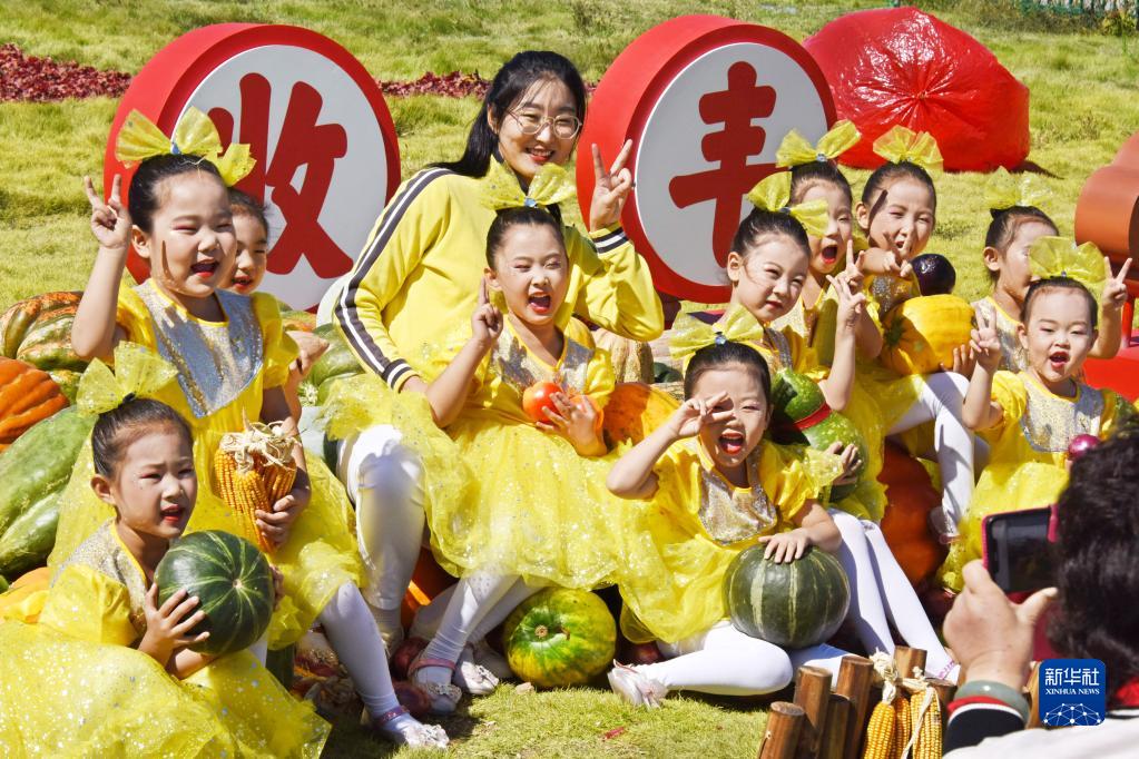 9月23日,青島平度大澤山鎮中心幼兒園的小朋友在豐收節上留影。