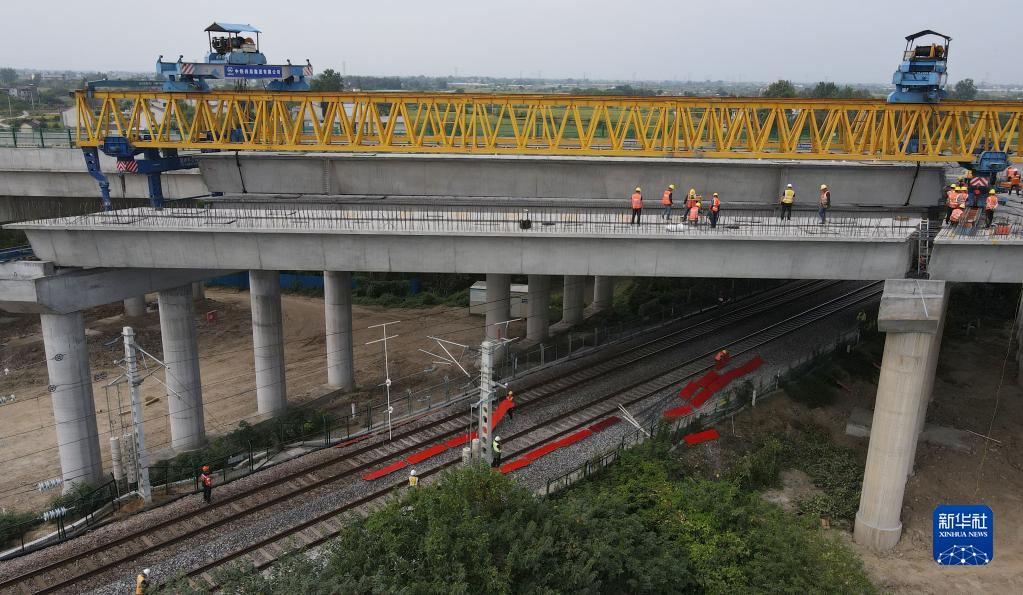 9月23日拍攝的蕪合高速公路上跨淮南鐵路箱梁架設施工現場(無人機照片)。