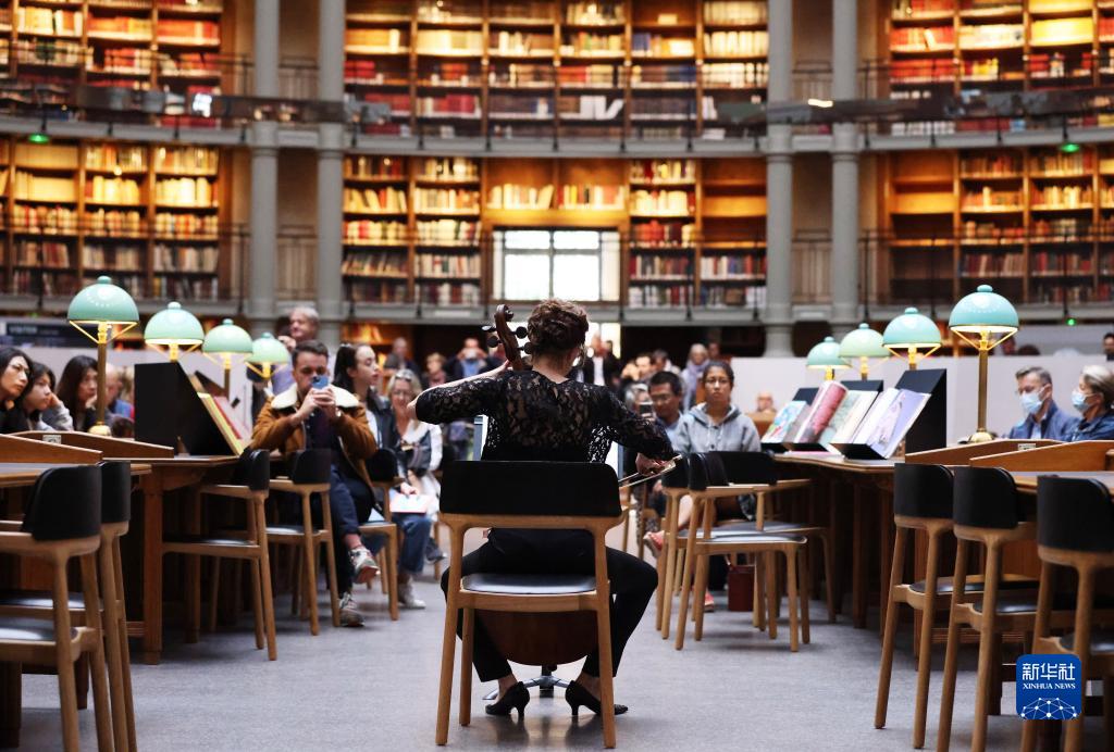 9月17日,在位于巴黎的法國國家圖書館黎塞留館,人們在“橢圓大廳”聆聽大提琴家的表演。