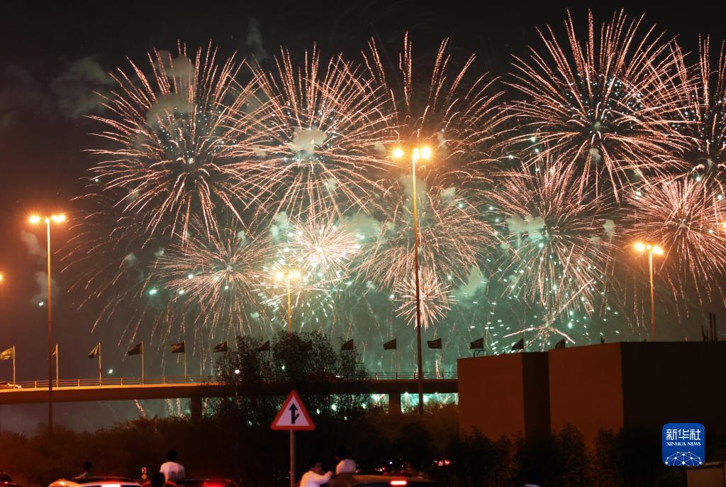 當(dāng)日,沙特多地燃放煙花,慶祝國慶日。