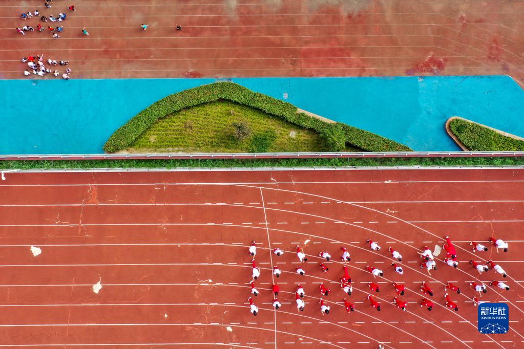 9月20日,齊河縣第六小學學生在空中運動場上體育課(無人機照片)。這所地處鬧市的學校將地下停車、地上教學、運動場地分層穿插布局巧妙融合,節地率達到54%。