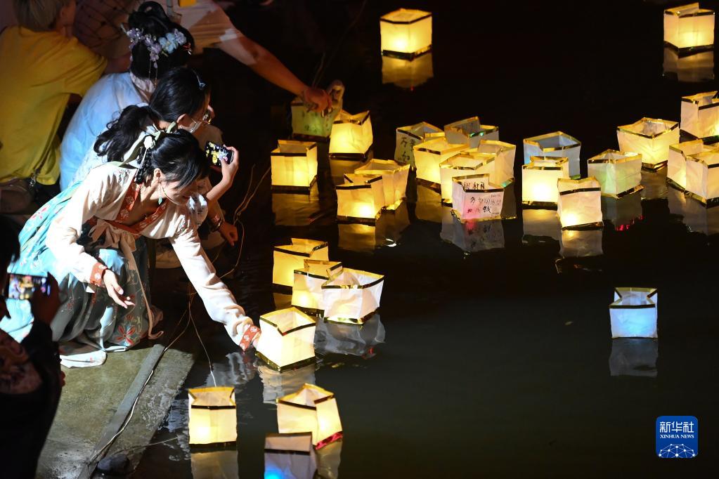 當日,浙江杭州宋城景區秋季主題活動“天燈節”啟幕,《河燈祈福》《華燈巡游》《華服秀》等主題演出和活動全新亮相,游客與演員同賞花燈,共放河燈,祈福納祥。