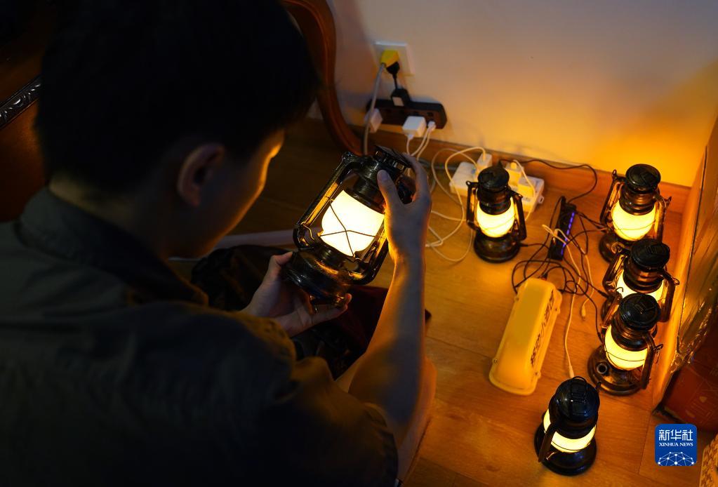 在南昌市紅谷灘區的一處公寓里,呂琦飛給露營燈充電(9月22日攝)。