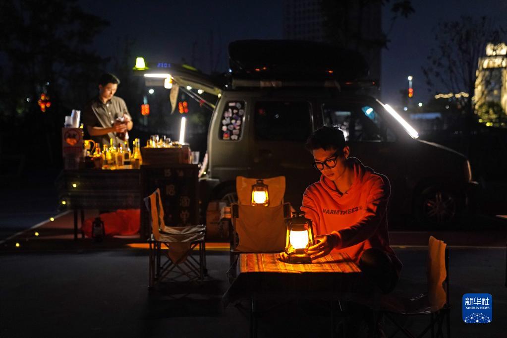 在南昌市紅谷灘區的一處空地,呂琦飛與張子聰(右)在為出攤做準備(9月22日攝)。