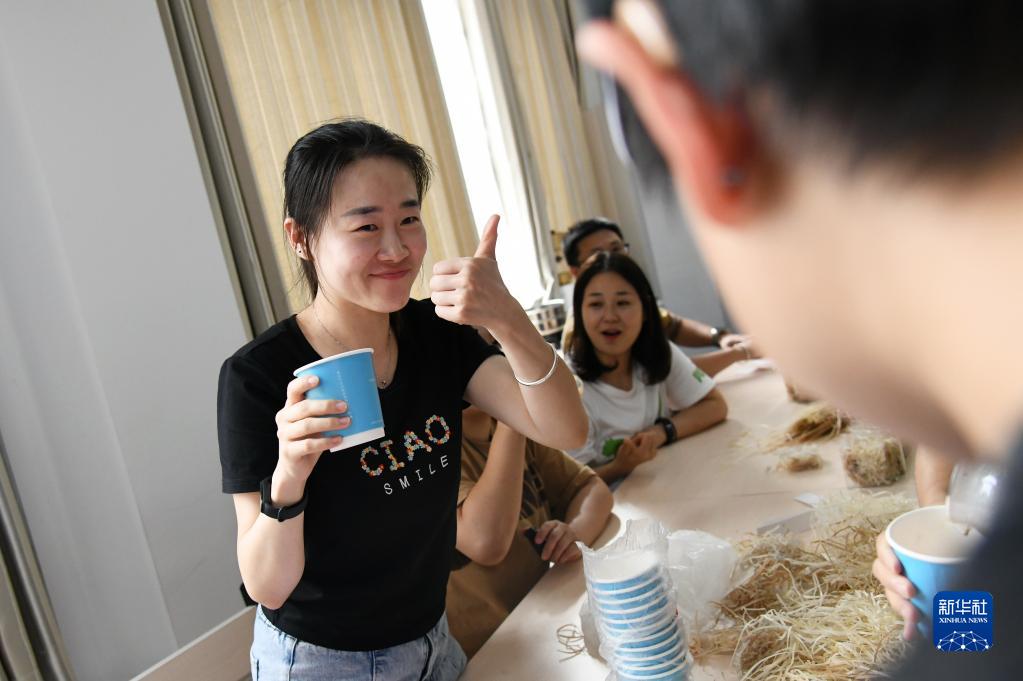 9月22日,在“無聲咖啡師”公益培訓課上,學員夸贊聽障咖啡師周潔制作的咖啡。