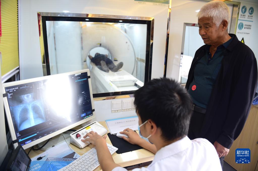 9月25日,滄州中西醫(yī)結合醫(yī)院放化療中心醫(yī)生在“移動CT”室內(nèi)為群眾進行肺部影像檢查。
