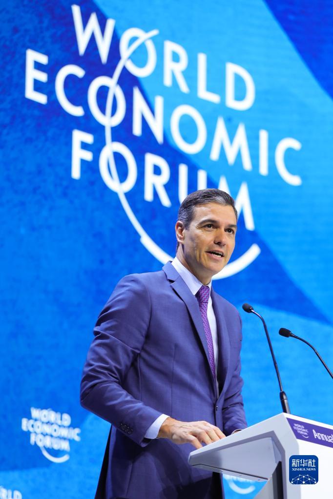 這是2022年5月24日,在瑞士達沃斯,西班牙首相桑切斯出席世界經濟論壇年會時致辭。