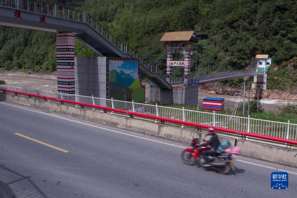 2022年9月14日,怒江州福貢縣拉甲木底村居民駕駛摩托車從拉甲木底橋下駛過。這座橋將過街天橋和過江橋梁相結合,方便行人過江、過街。新華社記者 岑云鵬 攝
