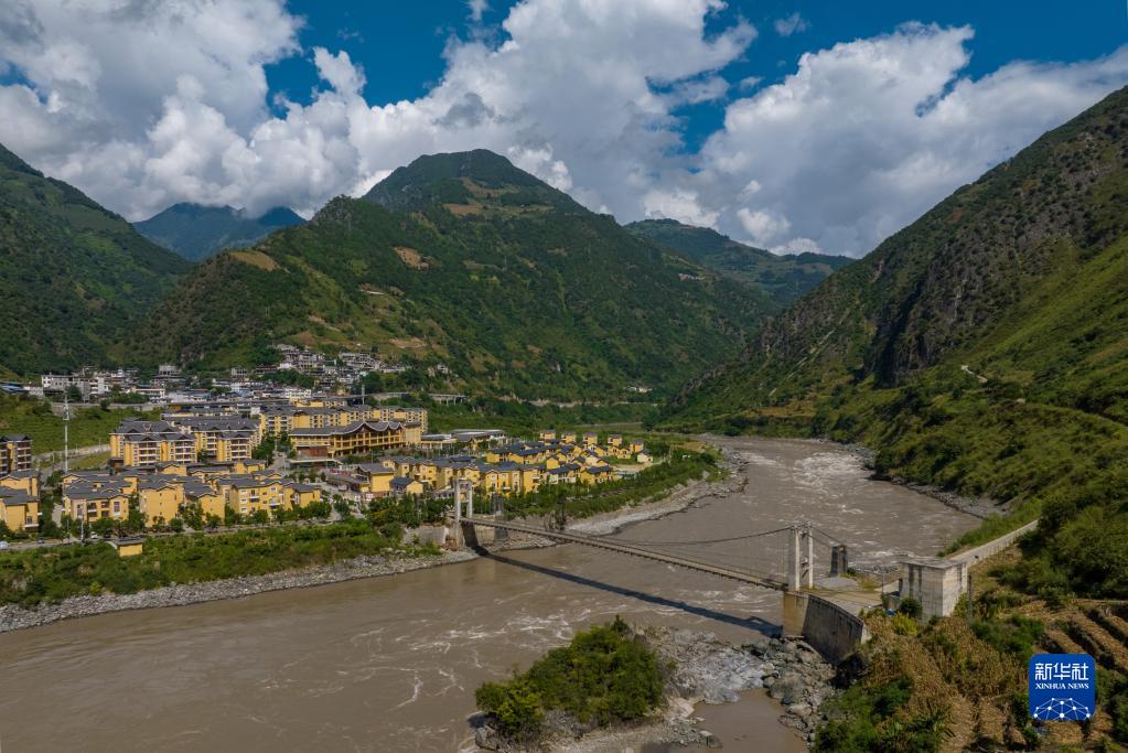 這是2022年9月13日拍攝的怒江州瀘水市維拉壩幸福橋。這座橋連接著居民安置點與農業生產區(無人機照片)。新華社記者 江文耀 攝