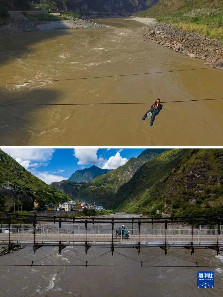 這是一張拼版照片:上圖為怒江州瀘水市稱桿鄉郵政所所長桑南才溜索過江送信(資料照片)。下圖為2022年9月13日,桑南才乘摩托車過江送信(新華社記者江文耀攝,無人機照片)。2021年,他被授予“全國優秀共產黨員”稱號。新華社發