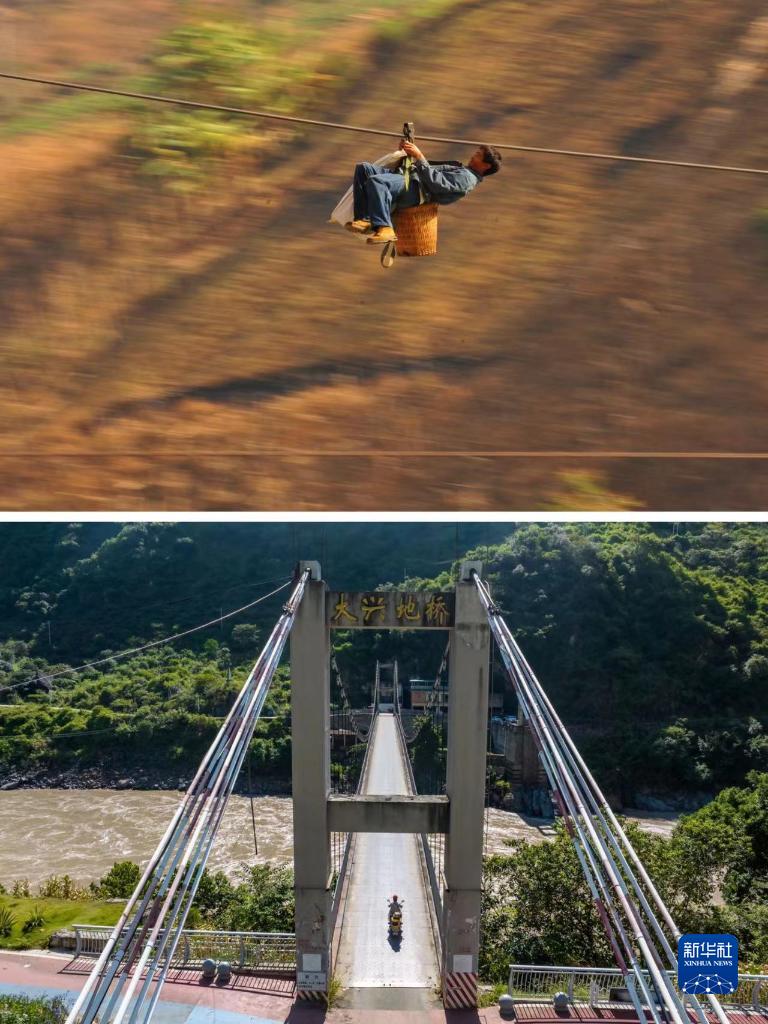 這是一張拼版照片:上圖為2013年2月2日,在云南省怒江州瀘水市六庫街道,一名居民背著背簍溜索過江(新華社記者王長山攝)。下圖為2022年9月13日,瀘水市居民騎摩托車通過大興地橋(無人機照片,新華社記者江文耀攝)。新華社發