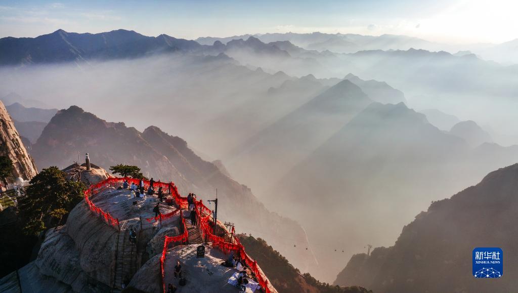 9月25日,夕陽西下,雨后初霽的西岳華山,云霧縈繞,宛如仙境(無人機照片)。