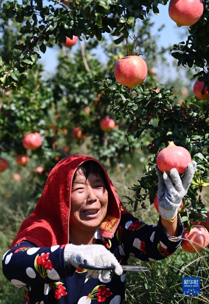 9月26日,在陜西省潼關(guān)縣港口社區(qū)東臺(tái)塬,裕興農(nóng)業(yè)開(kāi)發(fā)有限公司的員工在采摘軟籽石榴。