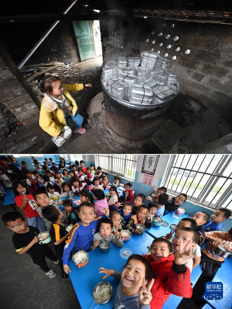 上圖:在廣西大化瑤族自治縣板升鄉八好小學,同學們將裝好米的飯盒放進鍋里。淘米、入鍋是那時孩子們每天上課前都要做的一件事(2014年11月24日攝);下圖:同學們在新食堂吃準備好的營養餐(2022年5月19日攝)(拼版照片)。