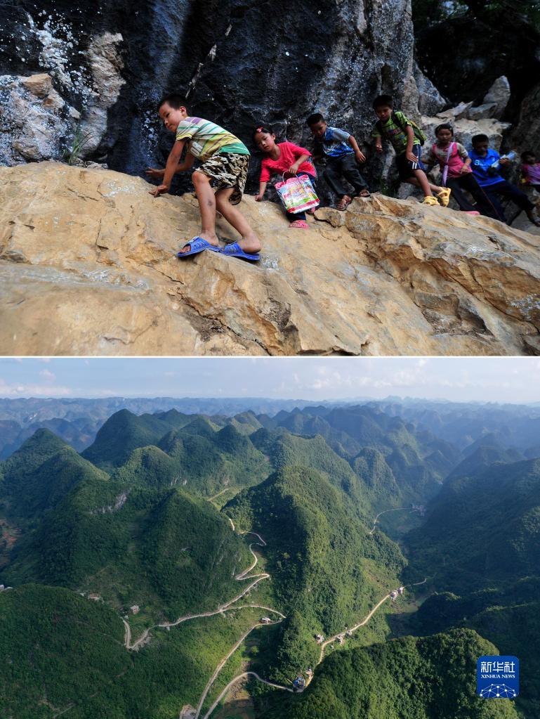 上圖:在廣西大化瑤族自治縣板升鄉(xiāng)弄雷村哈保屯,孩子們放學后爬懸崖回家(2012年9月5日攝);下圖:如今的弄雷村已實現(xiàn)屯屯通公路(2022年8月23日攝)。當年爬懸崖求學的孩子們,有些已經考上大學,有些還在讀高中,有的讀中專(拼版照片)。