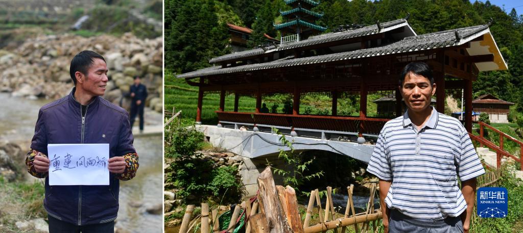 左圖:廣西融水苗族自治縣桿洞鄉(xiāng)烏英苗寨村民梁秀平展示村民們“重建風(fēng)雨橋”的夢(mèng)想(2018年12月24日攝);右圖:梁秀平站在新建成的風(fēng)雨橋前(2022年7月24日攝)。2017年夏天,烏英苗寨老風(fēng)雨橋被洪水沖垮,嚴(yán)重影響村民的生產(chǎn)生活。2021年,在對(duì)口幫扶的西北工業(yè)大學(xué)的捐助下,烏英苗寨重建了風(fēng)雨橋(拼版照片)。