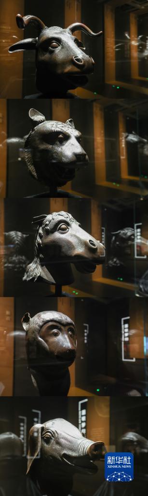 拼版照片:9月26日拍攝的展出的青銅獸首,從上至下分別為牛首、虎首、馬首、猴首、豬首。