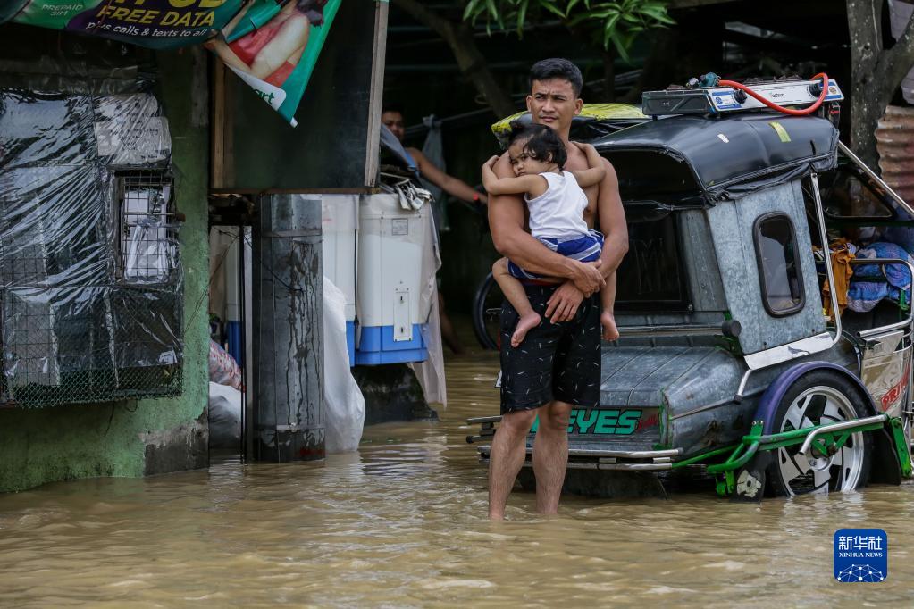 9月26日,在菲律賓布拉干省,一名男子抱著孩子站在積水的道路上。