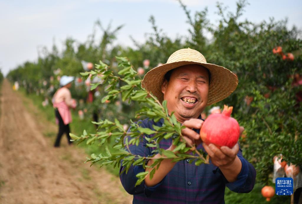 9月26日,果農在位于西安市臨潼區的石榴紅生態科技園展示剛采摘的石榴。
