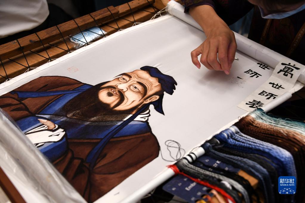 9月26日,錦繡非遺傳承人李銀鳳在創(chuàng)作錦繡孔子像。